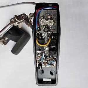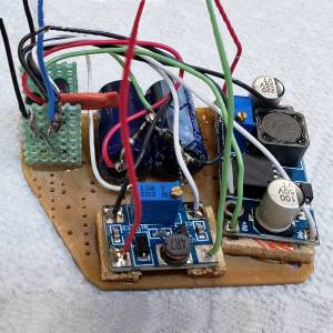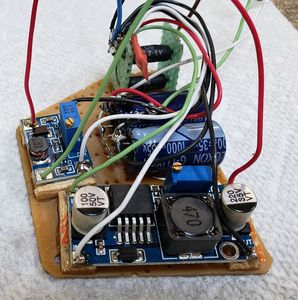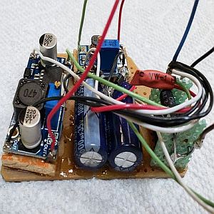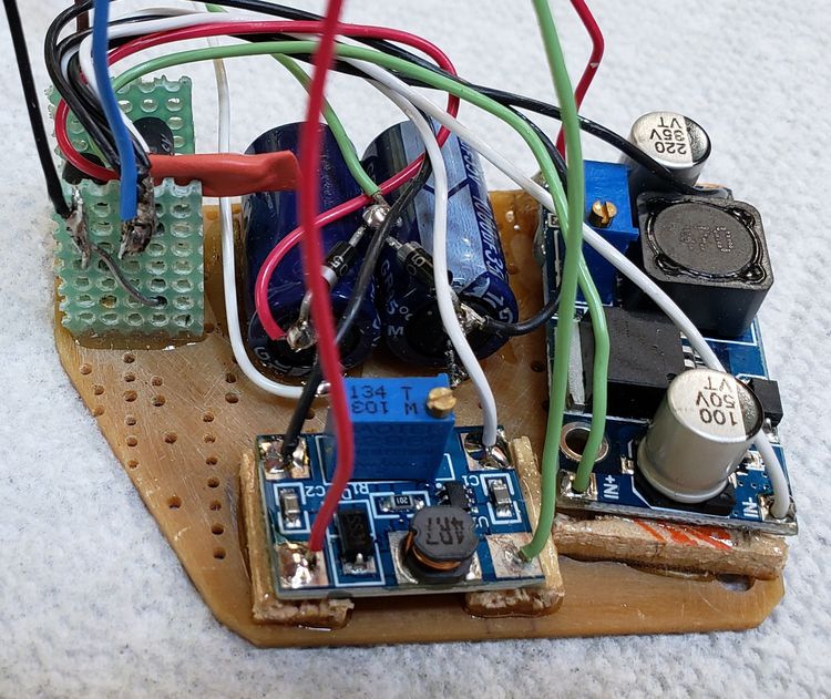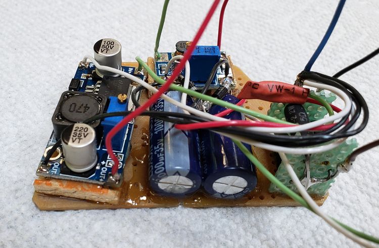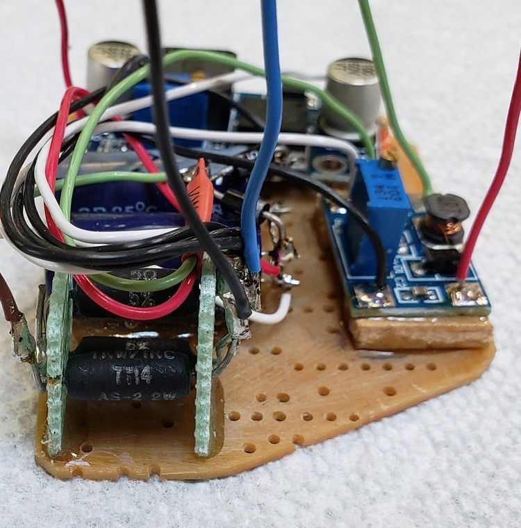 To permit easy removal of a defective module from the power box, the regulator modules we're glued to thin wood strips after wire pigtails were attached. Then the wood strips