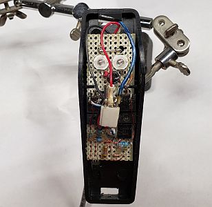 The headlight had to be slightly modified. First, the ground connection had to be removed. Second the lense had to be replaced with a piece of clear flat plastic. The original lense had focusing stripes in it to cover a wider area. The result with a LED emitter was to create a non-symmetrical light pattern.