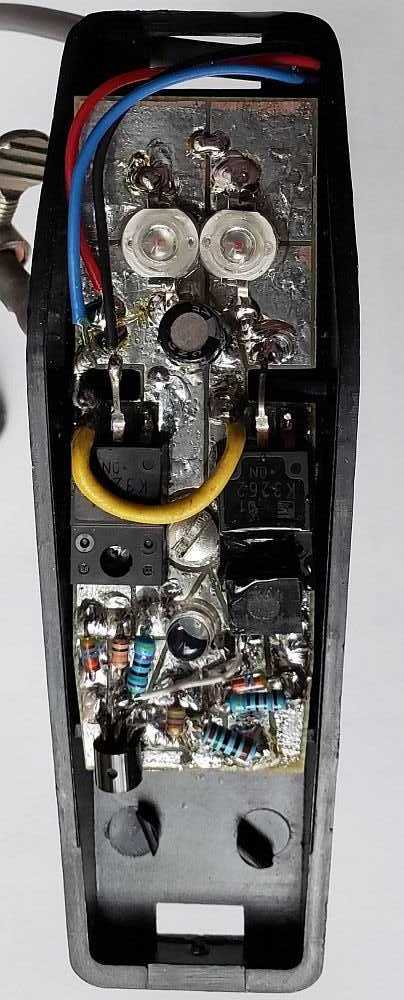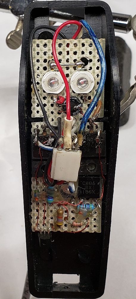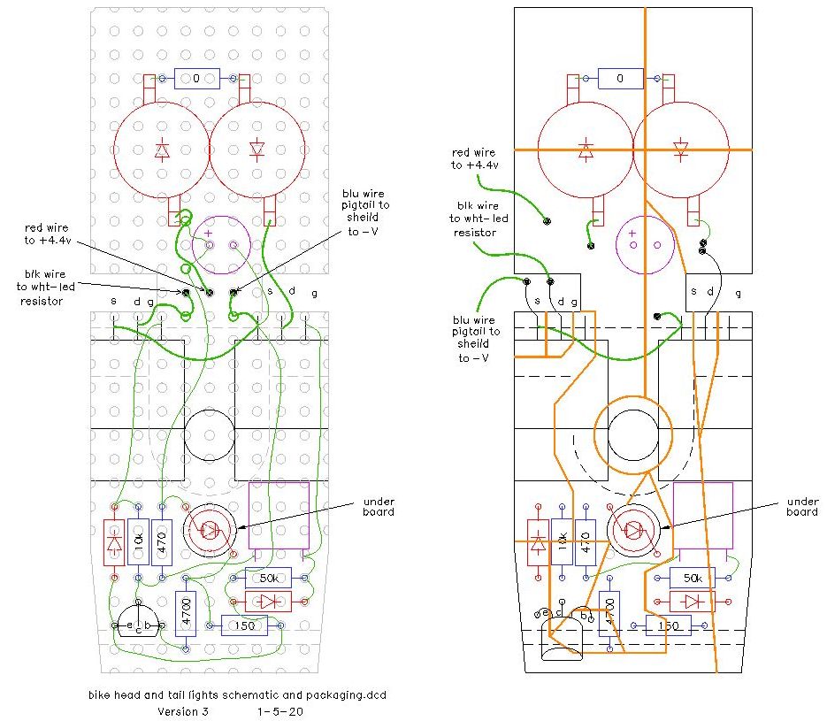 The taillight has two power FETs driven by a self flashing LED. One FET cycles the headlight to high and low output by connecting and disconnecting a resistor bank contained in the power box. The second FET supplies 20 ms, 4.4V pulses to the two power LEDs connected in series.