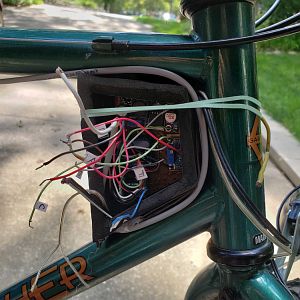 The odd shaped power box was constructed from available metal to fit the bike. Two side plates clamp the box to the bike. One side plate is glued to the bottom of the box.. The other side plate is screwed into a clamp plate inside the box. A thin rubber seal is compressed by the second plate to keep out water.