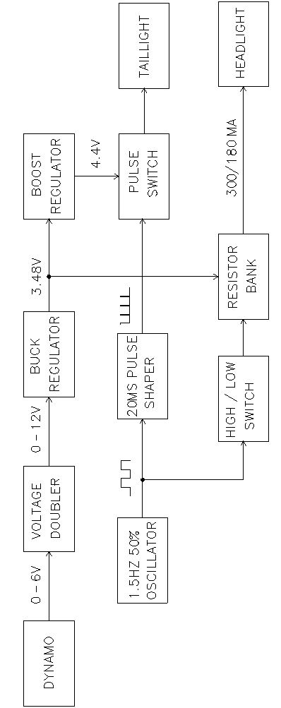 There are four elements in the lighting system: a power box containing a voltage doubler, an up converter, a down converter, and a resistor bank; a taillight containing a pulsing controller circuit; a dynamo; and a headlight.