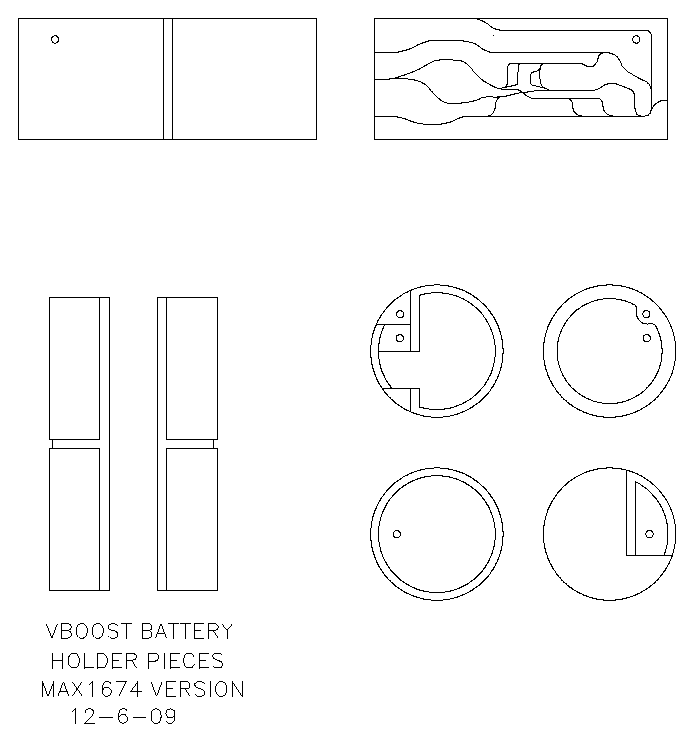 The battery holder in this version includes the circuit board and the contact ring to the LED supply and ground. I layed out the pieces of double-sided pc board using DesignCAD, taped them and etched them like I did with the charge-pump version, then soldered all the pieces together to make the battery holder.