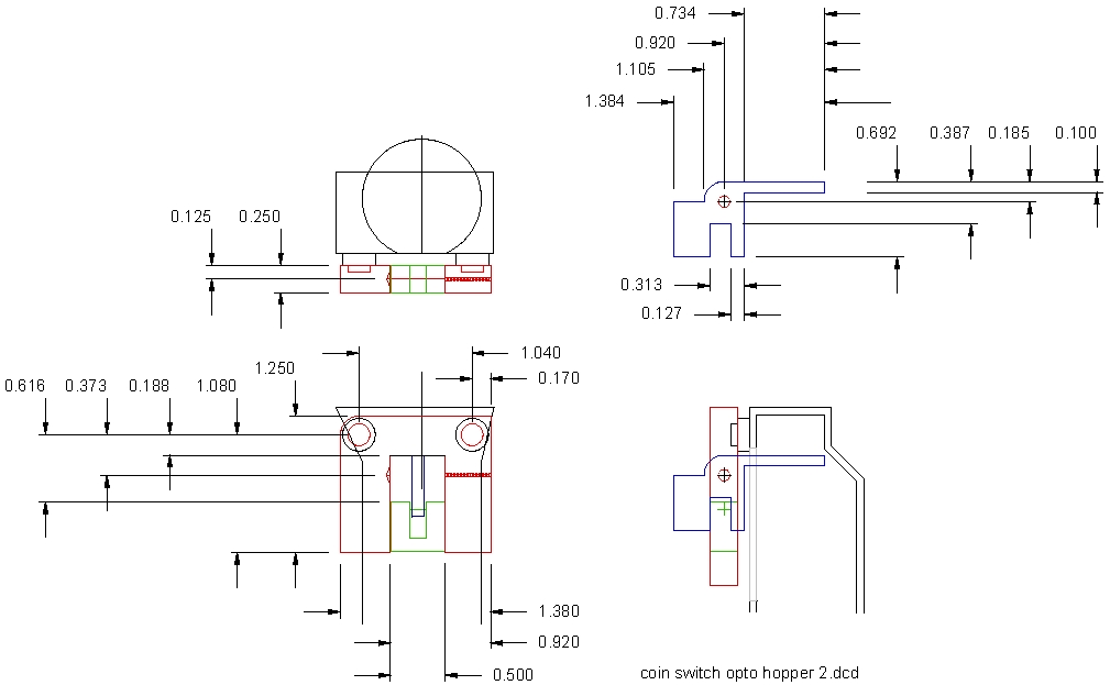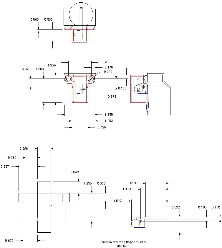 The first set of diagrams shown below are of my final version that uses a simple reed switch as the coin switch. The second set of diagrams and photos are of an opto-switch, coin detector that also worked, but used more parts. I have also included diagrams further down that show my original opto-switch that I built that had no moving parts. It worked, but drew too much current.