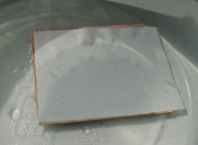 ...into a bowl of hot water. It will immediately bubble and begin to separate from the copper. Don't rush things, let it soak for a good 10 to 30 minutes. You may need to help the paper separate a bit... it won't float free on its own. But if you used a good hot iron, you won't have any trouble with trace mask peeling off the copper. It really fuses well. |