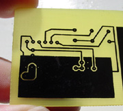 Here is a nice, close view of the etched board before the toner is stripped to reveal the copper. The pads in the lower left were originally octagonal, and they retain their shape perfectly. |