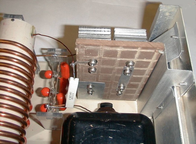 The capacitor and resistor leads were twisted together and soldered, then inserted into holes in the polycarbonate housing. Epoxy glue was used to cover the soldered wires in the housing holes to prevent corona. |