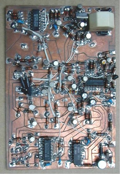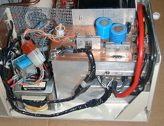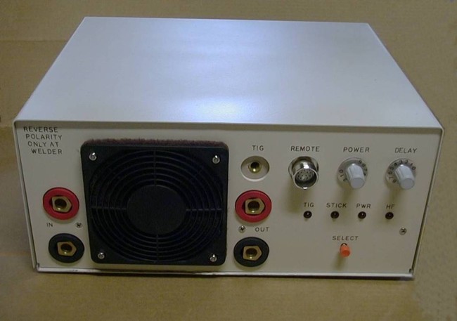 A double-sided circuit board holds the power-control and function-selector circuit. There are a lot of discrete components used in this circuit because I have them. It also made layout of the board easier. The function selection circuitry may not be to everyone's liking and could be stripped out and replaced by a rotary or other switch. I like the gas time-delay timer. It is very linear and uses a unique negative-slope linear ramp generator. But the best circuit on the board is the power-contoller. It uses a positive-slope linear ramp generator for phase timing, and the power-selection potentiometer is compensated to provide linear power selection. A simple oscillator in the gate driver gives multiple trigger pulses so the power SCRs will fire symetrically regardless of the phase lag variability due to an arcing or open-circuit welder. Some of the seemingly un-necessary components are the result of SwitcherCAD III simulations. |