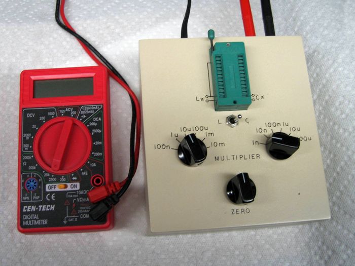 Be warned that I never got this thing to work well, especially the inductance part. After a lot of tinkering sporatically over five years, I gave up. During that five years, the price of a simple digital meter had dropped to less than I paid for the parts to build the unreliable meter I built. However, I am leaving the page here as my own reference and for anyone interested in such a project.