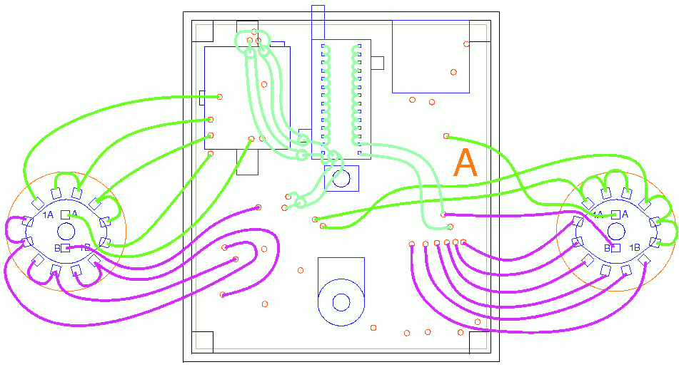 The layout to the right of the REV A layout is the board modification to add two 4017 SOIC devices to the existing proto board. These parts were not in the original design so I had to mount them upside-down on top of each other, and on top of the 74HC4060 DIP. It is not elegant. A new board layout would be very time consuming, but if it ever happens, I probably would switch to 74HC4017 and put them on the opposite side of the board. Maybe I could redesign the power supply to get them down close to the timer. There is room in the box to mount a separate power regulator board and get the power components of of the main board entirely.